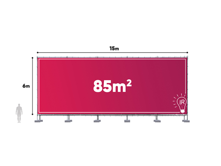 Konstrukcje reklamowe przy drogach ekspresowych muszą być oddalone przynajmniej 40 m od pasa drogowego. Przy takich odległościach potrzeba dużego formatu z ostrym przekazem. Konstrukcja reklamowa 15 x 6 (nogi 120 cm) idealnie wpisuje się w te potrzeby! Zwraca uwagę swoją wielkością, a nawet mała czcionka jest doskonale widoczna dla odbiorców, poruszających się z prędkością do 90 km/h. Konstrukcja reklamowa 15 x 6 m daje aż 90 m2 powierzchni, dając maksimum miejsca na Twoją komunikację z klientami.
